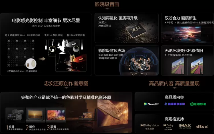 索尼拥有从拍摄到发行,从专业电影摄制设备、监视器到家庭显示设备,完整的电影产业链优势,并且做到了全系显示产品保持了和基准级监视HX310一致的色彩标准,能展现电影创作者真实想要传递的画面色彩质感,充分还原电影制片人意图。本年度的旗舰新品索尼电视9系,不但采用了索尼独家Mini LED背光控制技术,还搭载了基于索尼专业影像数据库数据升级了AI画质算法的XR芯片,全面优化了智能音画质表现,能为消费者带来媲美影院般的视听盛宴,充分体现了索尼全产业链的深厚积淀。