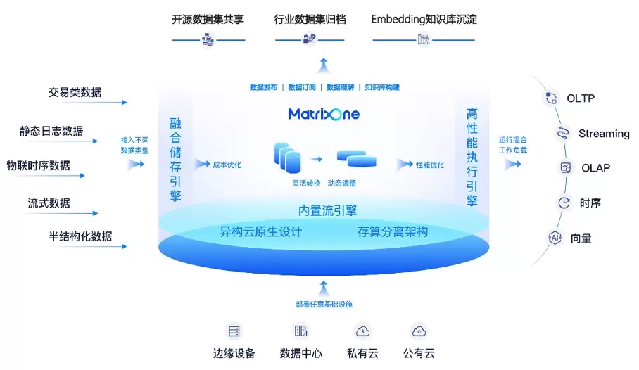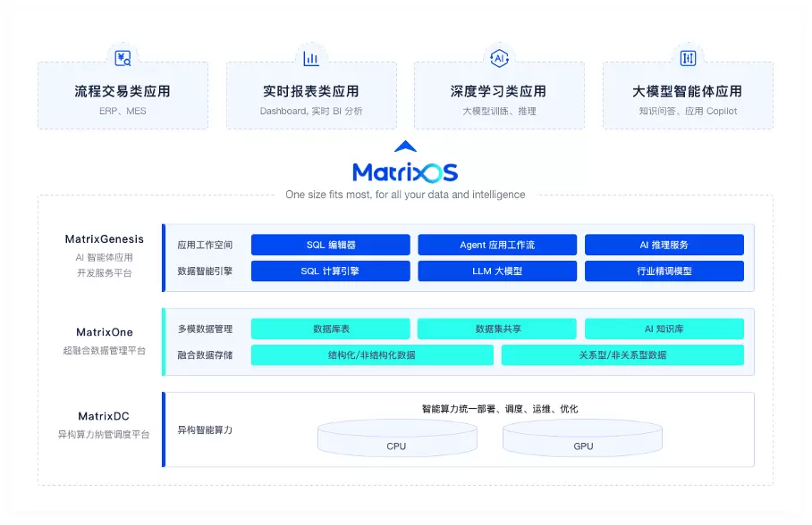 MatrixOne 是一款超融合数据管理平台。作为 MatrixOS 的数据处理层,它面向云原生和容器化设计,整体采用存算分离的架构,支持针对 OLTP,OLAP,时序,流计算,机器学习等多种异构负载,以及多种数据类型的处理。基于共享对象存储的存储层使得它得以极低的成本进行海量数据存储及分享协作,基于无状态容器化的计算层可以使得它快速弹性扩缩容以应对各类负载的波动。开发者可以基于 MatrixOne 快速的一站式的打造业务系统和数据分析应用,针对LLM大模型场景也可以基于其向量能力快速构建基于场景数据理解的知识库。MatrixOne 也是一个完全开源的项目,我们也非常欢迎社区开发者的加入和贡献。