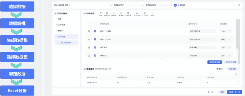 对大量数据的筛选与过滤是比较简单的应用场景,除此之外,Udata平台还会涉及到很多复杂数据分析的场景。在此场景下通常需要通过合并、过滤、字段设置等多种方法对数据进行预加工或预处理,将海量的数据转化到可以保证系统稳定处理的数据量区间,从而与表格控件进行结合,完成对数据的分析与展示需求。