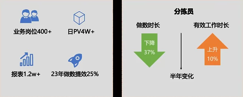 作为一款提供给一线人员使用的应用系统,Udata平台已经覆盖了内部4百多个业务岗位,日PV可以到达4万+,2023年的做数效率提升了25%。同时,对于一线人员分拣员而言,利用Udata平台实现做数时长下降37%,有效工作时长提升10%。