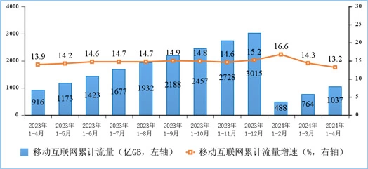 5月22日消息,根据工信部近日公布的《2024年1—4月份通信业经济运行情况》显示,2024年1—4月份,移动互联网累计流量达1037亿GB,同比增长13.2%。截至4月末,移动互联网用户数达15.4亿户,比上年末净增1277万户。4月当月户均移动互联网接入流量(DOU)达到17.82GB/户·月,同比增长6.6%。