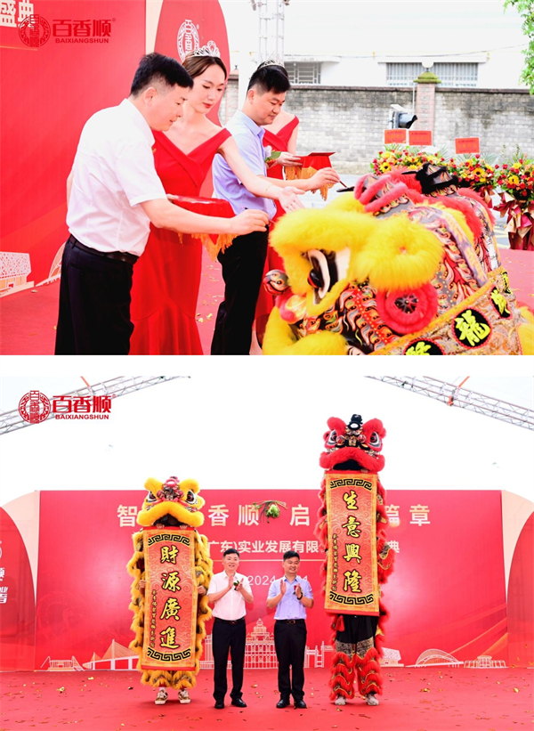 一段震撼人心的舞狮表演将庆典推向高潮,陈春旭董事长与江门市江海区副区长邓群标手持朱砂笔,为祥狮点睛。醒狮腾飞,雄狮吐瑞,它预示着百香顺(广东)实业发展有限公司在未来一定会大展宏图,事业兴旺,走向腾飞之路。