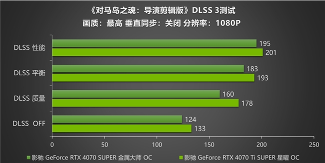 在1080P分辨率下,《对马岛之魂:导演剪辑版》展现了卓越的优化水平,同时也可以看到影驰GeForce RTX 4070 SUPER金属大师OC和影驰GeForce RTX 4070 Ti SUPER星曜OC两张显卡强悍的性能输出。即使不启用DLSS 3技术,两张显卡的成绩均能轻松达到平均120帧以上的水准,确保玩家能够拥有流畅的游戏体验。开启DLSS 3技术后,游戏帧率也是拥有明显的提升。在DLSS 3质量模式下,影驰GeForce RTX 4070 SUPER金属大师OC的帧数达到了160帧的平均帧,而影驰GeForce RTX 4070 Ti SUPER星曜OC的平均帧率更是拥有整整45帧的上涨。而在最为极致的DLSS 3性能模式下,两张卡的平均帧均超过了190帧的高分,影驰GeForce RTX 4070 Ti SUPER星曜OC甚至突破了200帧的关卡。这种优异的表现,不仅让玩家能拥有绝对精致的画面,同时还能保证极致流畅的游戏体验。