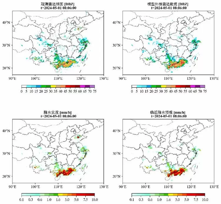 此外,要想实现高分辨率的区域性降水预报,传统的数值预报方法通常是对全球预报模式所获取的预报数据进行降尺度(类似于超分)来得到时空高分辨率的降水预报结果。这种方式除了所需计算资源多、推理速度慢以外,还有一个无法避开的问题:区域模式的启动需要进行内部计算的平衡(即spin-up),并且云也是由0开始积分,通常认为常见的区域天气预报模式需要3-6小时才能完成平衡过程,这也就导致这段时间内的降水是不太可靠的。