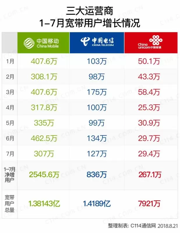 从具体数据来看,中国移动宽带客户7月净增客户数307万,本年累计净增客户数2545.6万,总数达到1.38143亿。中国电信7月固网宽带用户净增127万户,总数增至1.4189亿户。中国联通固网宽带用户7月净增29.4万户,用户累计达到7921万户。