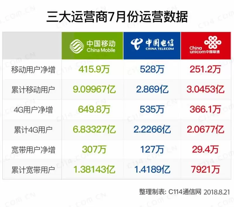 三大运营商7月份运营数据:中国移动“主角光环”大爆发