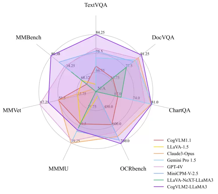 据悉,CogVLM2系列模型在多个关键指标上实现了显著提升,如在 OCRbench 基准上性能提升32%,在TextVQA基准上性能提升21.9%,且模型具备了较强的文档图像理解能力(DocVQA)等。此外,CogVLM2支持8K文本长度和高达1344*1344的图像分辨率,同时提供中英文双语的开源模型版本。