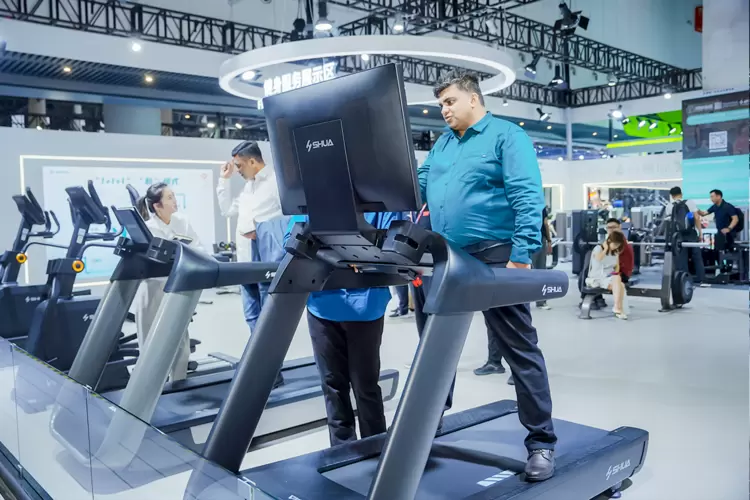32英寸全高清触摸屏,内置多种APP满足运动娱乐需求;全跑台多支撑减震系统,可有效减少跑台对膝盖反冲力;节能环保自发电椭圆机……本届体博会上,作为中国奥委会官方健身器材供应商,舒华体育带来了V10系列高端商用跑步机、健身车等多款入驻北京冬奥会和杭州亚运会的高端产品,每一处细节都彰显奥运品质,深受新老客户喜爱。
