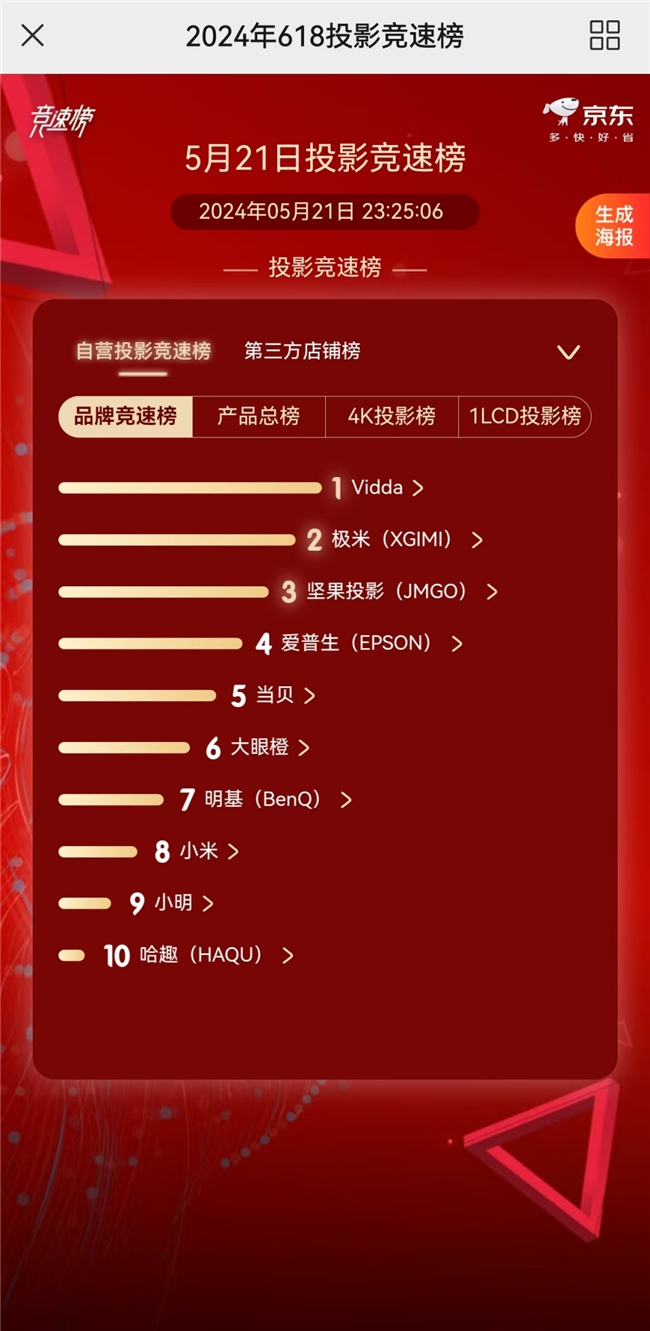 5月22日,今年618开门红战报逐渐出炉。数据显示5月20日至21日,Vidda在京东平台夺得4K投影销量和销售额双冠军;且在三色激光投影品类中,销售额更是遥遥领先,荣获总冠军。这一成绩充分展示了Vidda在投影市场的强劲实力与广泛认可,三色激光投影技术高画质、高亮度,以及健康护眼的优点也越来越收到广大用户的欢迎。