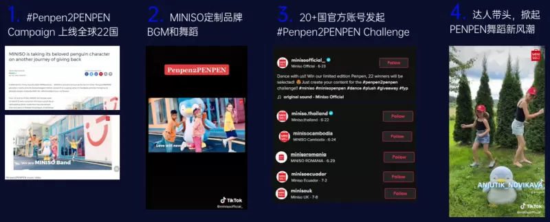 挑战赛:限量定制发行PENPEN公仔。在Facebook、Instagram和TikTok多平台发起hashtag challenge,邀请消费者跳PENPEN舞,即有机会获得限量版PENPEN公仔; 海外达人:搭配舞蹈/探店/亲子/时尚类等女性粉丝占比超过60%的红人为线上活动/门店活动引流; 全球PR:深入阐释活动理念、PENPEN项目背景和MINISO品牌背景,覆盖各重点市场; 门店气氛:通过店内电视屏幕播放视频、店内物料营造气氛、互动活动和PENPEN巨型人偶吸引人流。 |