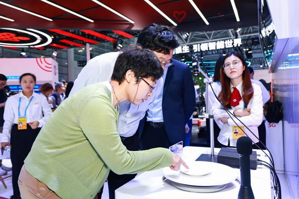 福建以茶闻名,中国联通茶叶智能产线展台吸引了众多参展者。在这里,根据体验者的定制要求,机械臂可自动取茶、封装、镭刻合盖,生产完成后又自动输送到储物柜,现场展示了无人工厂柔性化的生产流程,也为体验者提供一份专属定制茶叶,感受充满“AI”感的茶香余韵。
