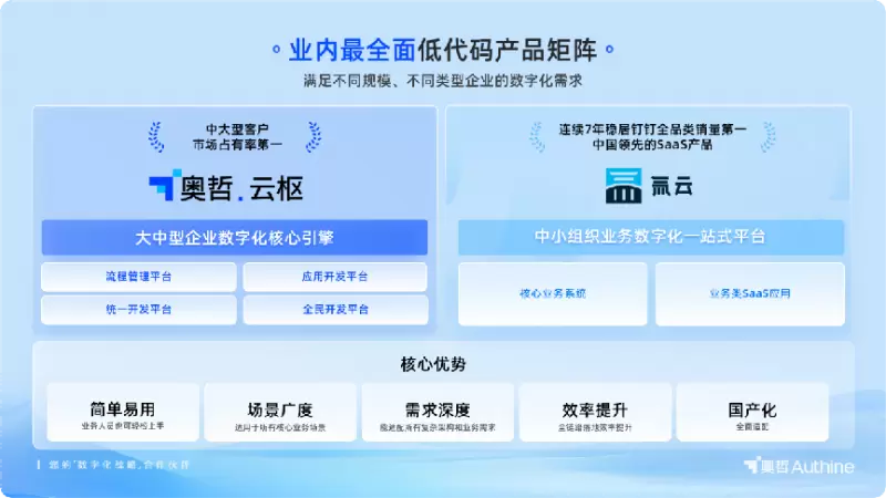 作为国内最早入局的低代码厂商,奥哲成立至今,产品根据技术发展及客户需求持续演进。区别于传统软件、SaaS以及云厂商,奥哲目前亦是国内唯一一家拥有完整低代码产品矩阵的数字化服务厂商,产品线涵盖奥哲·云枢及氚云,支持私有云、混合云和公有云等多种部署模式,兼具满足大中小企业的数字化转型需求。