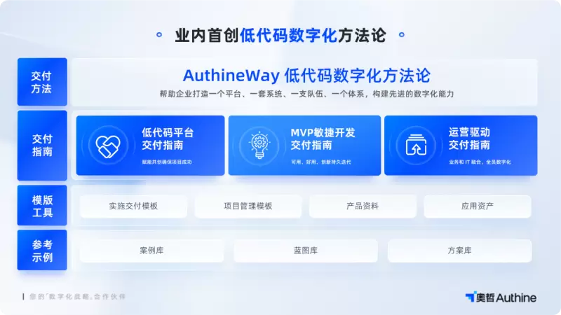 结合多年服务500强企业的低代码实践经验,奥哲沉淀出一套确保数字化目标快速落地的方法论——AuthineWay低代码数字化方法论。该方法论以共创和共融为核心理念,强调平台+服务的支撑模式,注重与企业原有技术资产的共生,并推动技术与业务的相互赋能,助力企业打造“一个平台、一个体系、一套系统、一支队伍”。