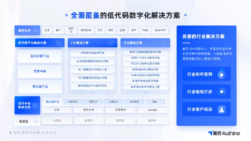 此外,基于多年的低代码产品实践,奥哲打造出基于低代码平台,覆盖10+主流行业数字化转型综合解决方案,沉淀了平台、LTC等低代码数字化解决方案,可以满足不同行业企业在流程数字化、业务数字化、全员数字化等不同阶段的需求,为客户提供全面支持。