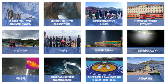 适用场景:应急通信、应急救援、强光照明、侦察搜索、物资抛投、地理测绘、电力/油气管道巡检、国土资源测量。
