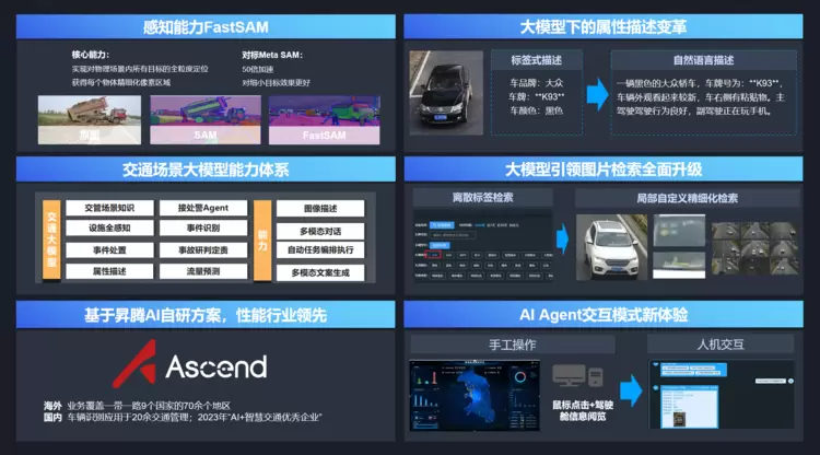 此番获奖的秦岭·秦川大模型,是基于视语坤川®L0基座大模型的基础上,面向智慧交通领域推出的行业大模型,自发布以来就以其强大的通用视觉能力与交通领域的专业智能能力吸引了业界的广泛关注。该模型由中科视语、西安市雁塔区政府、西安市未来人工智能计算中心联合打造,该模型结合当地海量开放场景下的交通生态数据、中科视语自研的大模型能力、未来人工智能计算中心强大的昇腾AI基础设施,构建了千亿级参数规模的“交通大脑”,可为智慧交通行业的各垂直场景应用提供更聪慧的解决方案。该大模型具备多模态能力,能够处理人、车、路、交通事件、交通规则等不同类型的多元异构数据,实现以文/图搜车、违法举例、路口/信控优化、最优路线规划等功能,为路网监测、应急指挥、养护管理、公众出行等智慧交通全场景带来数智化变革,目前已在交通安全管理、道路管理养护、城市交通拥堵治理等场景实现应用落地。