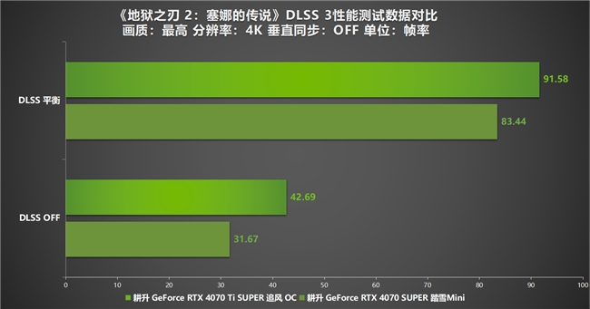 对于追求最高画质的玩家而言,4K分辨率才是最佳选择。如图所示,在4K分辨率下游戏所需配置要求极度升高。在关闭DLSS 3的情况下,即使是耕升 GeForce RTX 4070 Ti SUPER 追风 OC显卡,在不开启DLSS的情况下,平均帧数也下降到了42.69帧。而耕升 GeForce RTX 4070 SUPER 踏雪Mini更是只能达到平均31.67帧,难以流畅运行游戏。但通过开启DLSS 3,耕升 GeForce RTX 4070 Ti SUPER 追风 OC在平衡模式下能够维持平均91.58帧的帧率;耕升 GeForce RTX 4070 SUPER 踏雪Mini也能够达到平均83.44帧。