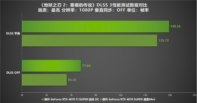 首先我们进行1080P分辨率的测试。可以看到在关闭DLSS 的情况下,耕升 GeForce RTX 4070 SUPER 踏雪Mini来到平均66.26帧,耕升 GeForce RTX 4070 Ti SUPER 追风 OC则平均77.86帧,虽然能确保游戏的流畅体验,但不算一个高的帧数。不过开启DLSS 3技术后,游戏帧率显著提升。在DLSS 3技术的平衡模式下,耕升 GeForce RTX 4070 SUPER 踏雪Mini的平均帧率达到了139.72帧,而耕升 GeForce RTX 4070 Ti SUPER 追风 OC的平均帧率则为149.35帧。相较于未使用DLSS 3技术的情况,帧数的提升接近两倍。这样的性能表现不仅让玩家能够享受高质量的视觉效果,还能保证游戏过程的无缝流畅。