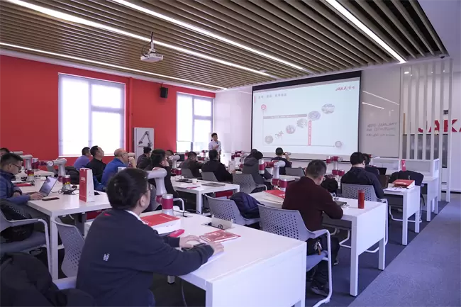 在节卡学院的培训教室里,一群来自某头部精密制造企业的各事业部技术专家正在进行着协作机器人技术与应用的专业培训。该企业是节卡机器人的重点客户之一,在良好的战略合作推动下,节卡机器人为客户制定了一套专业、系统的培训课程,从智能制造理论到实践,从知识学习到技术实操,旨在帮助客户加速推动“两化”发展的速度和效率。