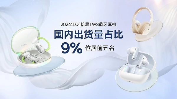 在 2023 年 Q4 季度,Baseus倍思的 TWS 真无线耳机国内出货量占比已经达到了 8%,全国位居第五名,仅次于 Apple、华为、小米之类的头部品牌。最新披露的统计数据显示,2024 年的 Q1 季度,Baseus倍思依旧稳住了国内 TWS 真无线耳机出货量的第五名,占比提升到了 9%,进一步缩小了与头部品牌之间的差距。