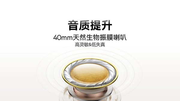 为了实现更优质的声音表现,Bowie H1s 采用了 40mm 天然生物纤维振膜,柔韧而有弹性,低音量感提升约 20%;从深沉到清亮高音全音域表现力十足,听感均衡富有动态。支持 BISA 倍思空间音效技术,高度还原更丰富、鲜活的音质。