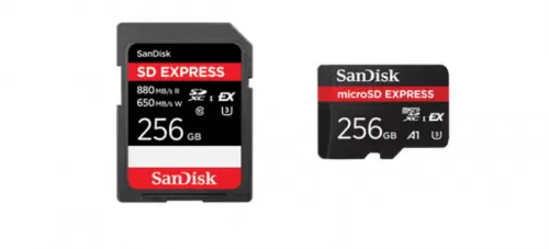 从左到右依次为闪迪SD Express 存储卡及闪迪移动microSD Express 存储卡