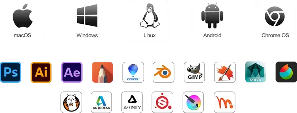 ugee友基UE16绘画屏⽀持Windows 7及以上版本、macOS 10.12及以上版本、Chrome OS 88及以上版本、Android 9.0及以上版本(USB3.1 DP1.2),以及Linux等各⼤主流系统;且适配如Adobe Photoshop,Illustrator,SAI,CDR,GIMP, Krita, MediBang, Maya, Blender3D, 画世界PRO, ibisPaintX, Concept等各类主流绘画设计软件,只需一屏在手,即可开始你的创作生活!