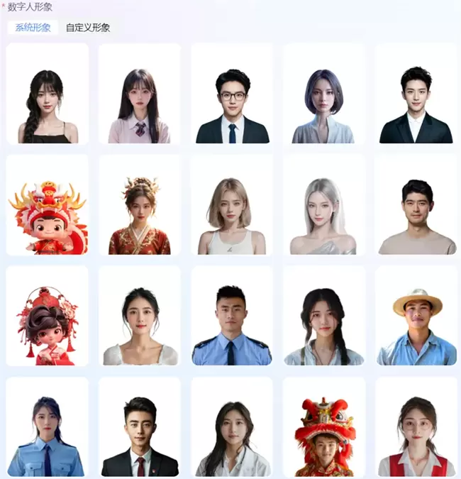 用户根据行业背景、岗位需求和社交特点,在数字人形象库中挑选并设定形象。通过关键字智能匹配,自动生成高度契合的描述,让数字人形象更加生动、有趣。