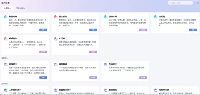联合生态伙伴共建能力超市,构建基础能力、服务能力、业务能力,提供AI写作、视频创作、政策解读、专家助手、虚拟会议、任务分解等精准内容服务,提高办公效率。