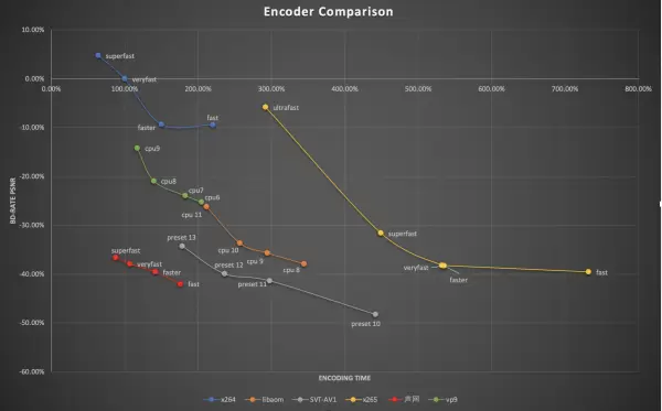 图1:EncodingTime:编码速度,越往左速度越快;BD-RATE:编码压缩率,越往下压缩率越高