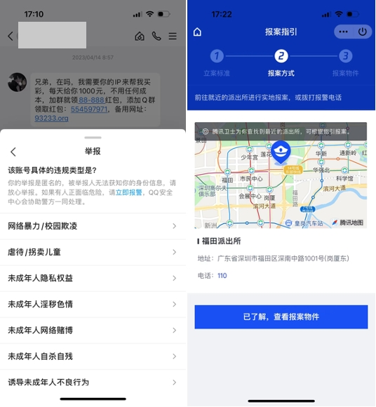 为给青少年用户提供快捷、有效、有用的举报能力,QQ特别增设了未成年人专属快速举报通道,并细化有害标签,一方面指引用户顺利完成举报,另一方面也确保平台能以最快的速度核查处理涉未成年相关的举报内容。同时,平台举报流程中还会为用户提供快速报案指引,根据用户地理位置为其提供最近的派出所信息及报警热线。