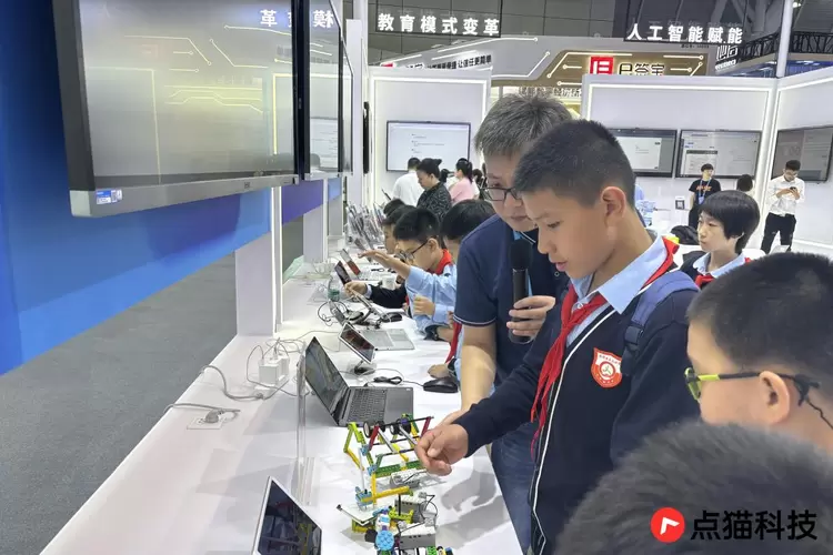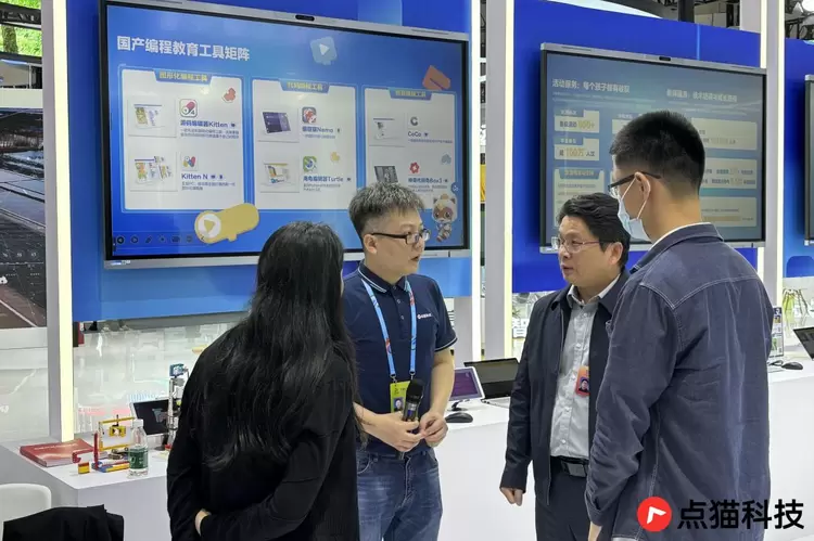自成立以来,点猫科技一直持续致力于数字技术创新,构建了独立自主的国产数字工具生态,推出了图形化编程工具、Python编程工具、创意编程工具等多样化、多终端的国产编程工具矩阵。展位现场展出的Kitten N、源码编辑器Kitten4、海龟编辑器Turtle、编程猫Nemo、CoCo等多款编程工具,吸引了众多观众前来亲身体验,感受数字创造的魅力。点猫编程平台作为集教学管理与课程资源一体化的人工智能云平台,支持课堂教学开展、AI双师教学、赛考活动举办、编程学习创作等多种场景,其强大的功能性和应用性,也成为了现场观众交流探讨的热点话题。