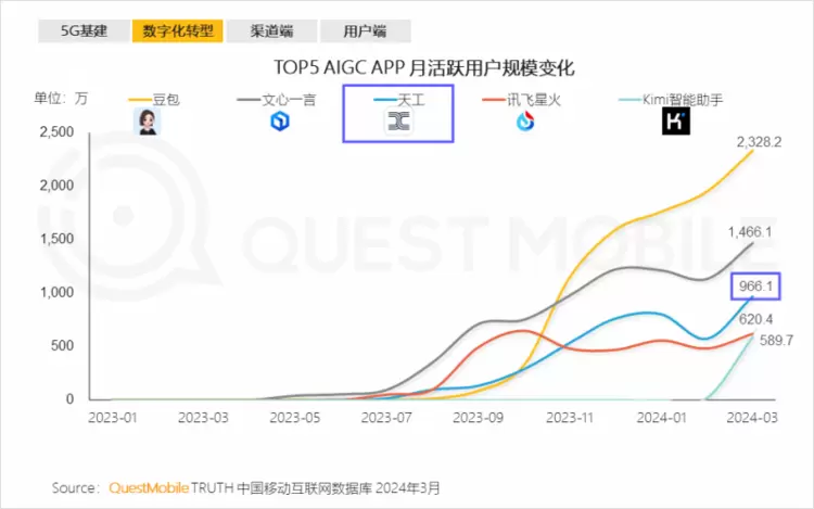 根据国内商业智能数据服务商QuestMobile数据,早在2024年3月,昆仑万维天工AI APP的月活跃用户已达近千万,仅次于豆包与文心一言,成为国内AIGC APP月活跃用户第三。
