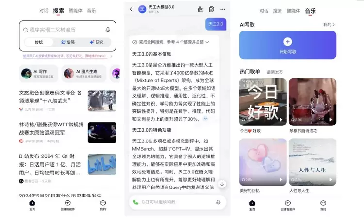 (天工AI搜索、AI对话、AI音乐用户界面)