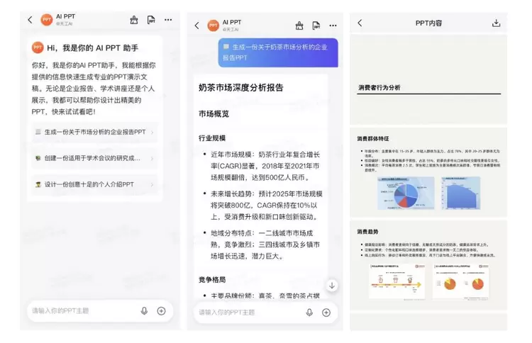 天工AI最新上线的AI PPT则是近期最受用户欢迎的AI智能体之一。用户只需要输入PPT内容需求,天工AI即可立即在线生成一份完整、可编辑的PPT大纲及各页内容文本,并实现智能检索图片、智能匹配模板,一键生成内容完整、逻辑清晰、布局优美的PPT文档,用户可在线或下载到本地进行编辑与分享。