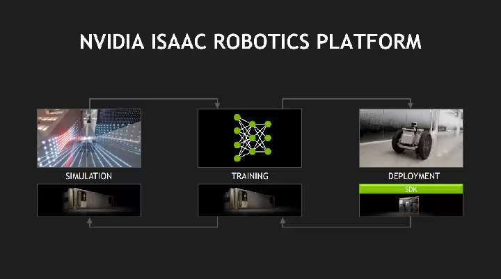 在今年台北电脑展的发布会上,英伟达发布了 NVIDIA Isaac 机器人平台,包含硬件、软件和虚拟世界机器人模拟器的 NVIDIA Isaac。