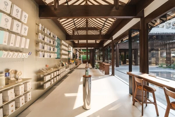 店内部分则最大程度保留川西民居穿斗式木质结构,传承300年古民居的结构之美,同时结合荣耀零售终端形象4.0(简称SI 4.0),在体验动线里嵌入中式园林景观小品,运用框景,对景等手法,以小见大,移步换景,为消费者带来丰富的感官和新零售体验。荣耀零售设计团队还与知名设计机构合作,对门店室内分区设置照明系统、动态建筑氛围光效、互动展示墙面,为古朴建筑空间引入创新科技体验。