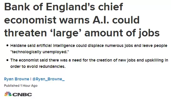 北京时间20日晚,英国央行首席经济学家安迪-霍尔丹(Andy Haldane)周一表示,人工智能(AI)有可能会取代大量的工作岗位。