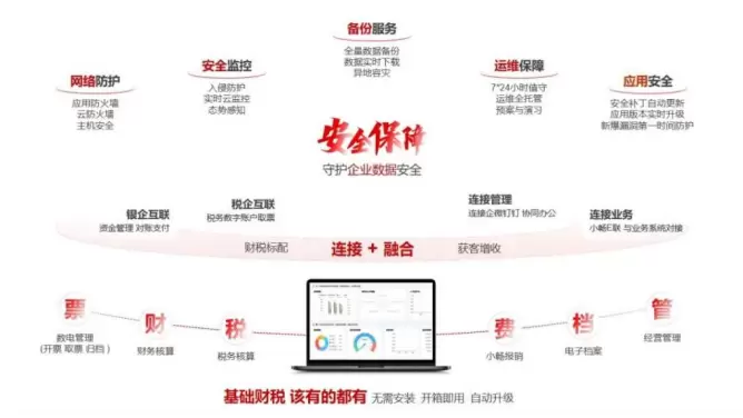 另一方面,当前网络安全已经上升到了国家安全的层面,为推动我国网络安全体系的建立,树立正确的网络安全观指明了方向:“没有网络安全就没有国家安全,没有信息化就没有现代化。”在此背景下,数据安全、智能提效、财税合规已成为小微企业持续发展的关键核心。