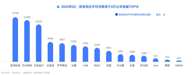 得益于AI大模型和AIGC软件应用齐头并进,AI产品经理、研发算法等AI岗位需求和薪酬都在暴涨。2024年Q1,在新发岗位平均月薪超过4万元的企业中,AI四小龙之一的商汤科技新发岗位平均月薪涨幅12799元,位列涨幅榜第一。其次便是本次活动主办方万兴科技,涨幅118 26元。