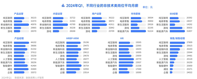 根据脉脉高聘发布的《2024春招高薪职业和人才洞察》报告显示,2024Q1产品经理在绝大部分不同行业的非技术类岗位中平均月薪位Top1。