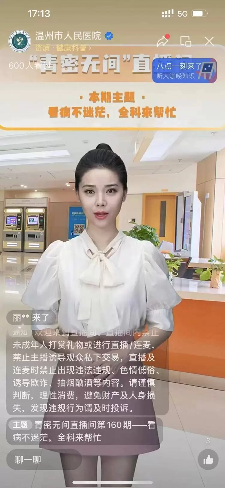 “ 我是医生数字人小安,今天我们将讨论有关心血管健康的话题。”“ 对于患有糖尿病的患者,饮食管理至关重要。今天我们将分享一些关于糖尿病饮食的基本原则和实用建议。”“医生,我最近总是感觉到头晕,有什么可能的原因吗?”诸如此类的对话频繁发生在温州市人民医院的数字人直播间内。