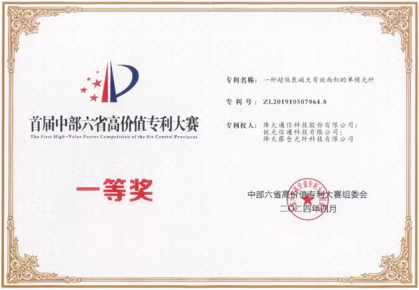 近日,烽火通信《一种超低衰减大有效面积的单模光纤》(专利号:ZL201910507964.8)获首届中部六省高价值专利大赛一等奖。本次大赛由湖北、山西、安徽、江西、河南、湖南六省知识产权局联袂主办,以“携手培育高价值专利,赋能中部高质量发展”为主题,旨在推进六省乃至国家创新创业从高速增长转为高质量发展,引领科技发展方向。