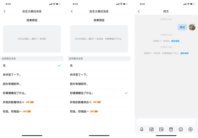 具体到场景中,用户在进行消息撤回操作时,可利用这段自定义文字来说明撤回的具体原因,比如“发错了,内容需要修改”。用户也可以通过个性化文案展示来增加撤回消息的趣味性和互动性,比如“xxx撤回了一条消息,你猜猜撤回了什么”。这样一个灵活的消息撤回功能,不仅能提升用户体验,也能让用户在撤回消息管理上有更高的自由度和灵活性,从而营造更愉快和富有互动趣味性的沟通环境。