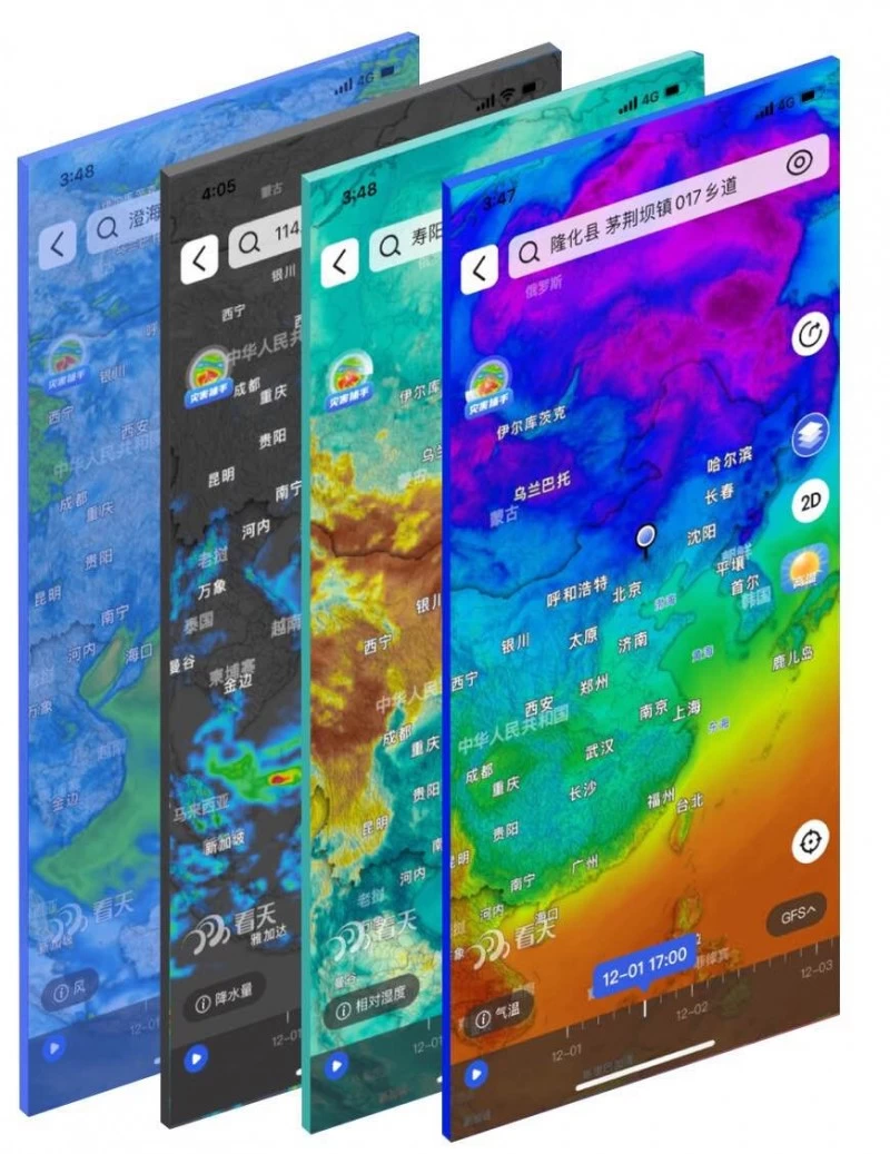 应用内集成了30多种气象可视化图层,用户可自由选择2D或3D模式,直观地感受天气变化。