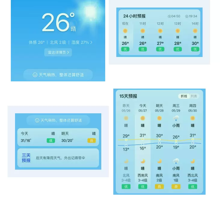 “看天”的应用场景广泛,无论是24小时的实时天气预测,还是3天、15天的天气预报,都能帮助用户提前做好相应准备。此外,体感温度功能还能为用户提供穿衣建议,为用户提供细致贴心的出行服务。