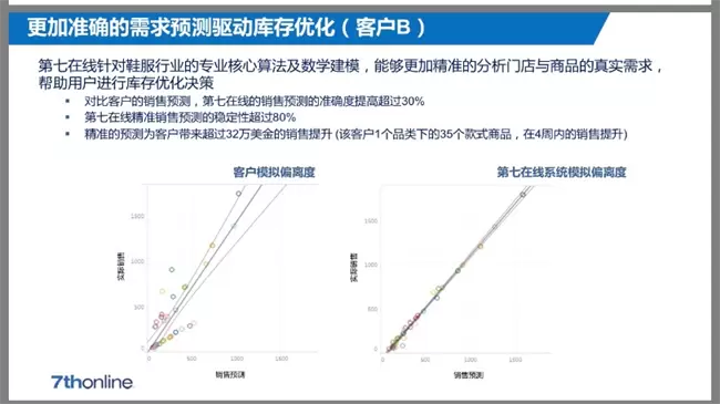 自2015年双方合作伊始,该品牌对自身预测能力充满信心,并未立即采用第七在线的预测工具。然而,到了2018年,出于好奇,他们开始将第七在线的预测结果与其自身预测进行对比。令人惊喜的是,第七在线的预测不仅精准度高出他们30%,而且稳定度更是超过他们80%。这一发现使得他们在某一品类中的32个款式,每四周便能多赚230万人民币,这无疑是一次意外的收获。自此之后,该品牌便一直采用第七在线AI商品计划系统,取得了显著的成效。