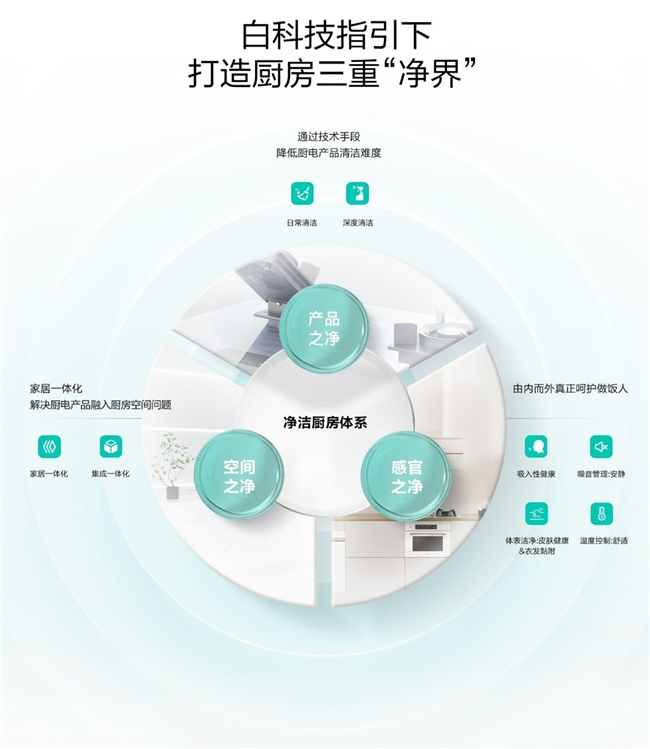 而“净洁厨房”概念的意义,就是为了解决上述消费者关心的问题。所谓“净洁厨房”,是由“产品之净”“空间之净”“感官之净”三大维度构建而来,不仅要从日常清洁、深度清洁两方面由内到外提升产品清洁力,通过“超薄”、“一体化”、“集成”等形态简化打造整洁、清爽的视觉效果,还要聚焦用户的感官体验,改善厨房空气质量、降低噪音及温度,让消费者得到更舒适的体验,打造清洁、健康和安静的厨房环境。