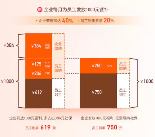借助会补贴平台,企业可以从员工工资总额里面近1/3的金额用来列为员工的福利支出,帮企业降低高达40%的福利发放成本,供应商丰富可选择性多,支持企业统一平台采买,为企业开具对应合规发票。通过薪酬结构优化,增加员工到手多得近20%,积分1:1兑换,移动端操作便捷,有效提升员工满意度。