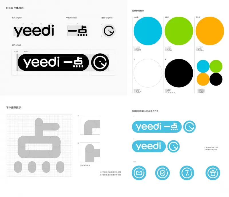 我们将“一点”符号化,加强品牌核心“记忆”,强调「yeedi一点」带给用户的品牌价值:「轻松只需一点,干净不在话下」。将“一点”符号与logo图形及logo字标进行结合,使图标、字体、传播符号之间相互关联,构建完整品牌视觉元素体系。